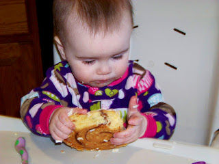 I love this picture of Avery. Somehow, I remember the other 3 girls having a bit more hair around a year, but I was still able to force it into a cute little ponytail on her head. - I heard all kinds of giggles and side-comments about "the cute little baby & her tiny pony on top of her head".